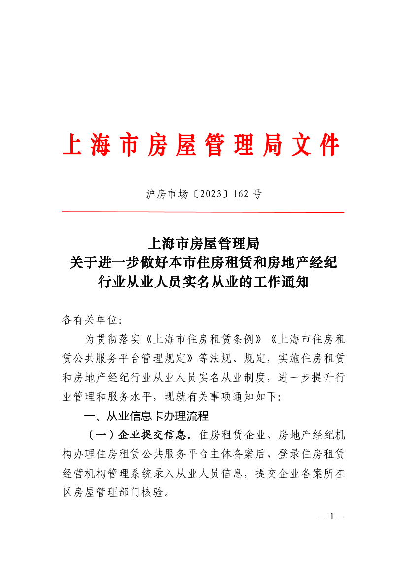 为贯彻落实《上海市住房租赁条例》《上海市住房租赁公共服务平台管理规定》等法规、规定,实施住房租赁和房地产经纪行业从业人员实名从业制度,进一步提升行业管理和服务水平,现就有关事项通知如下:
