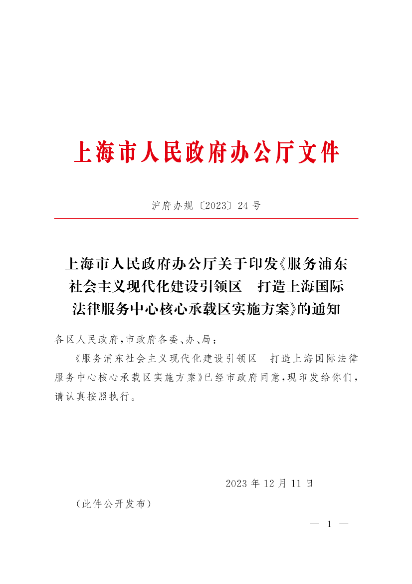 上海市人民政府办公厅关于印发《服务浦东社会主义现代化建设引领区 打造上海国际法律服务中心核心承载区实施方案》的通知