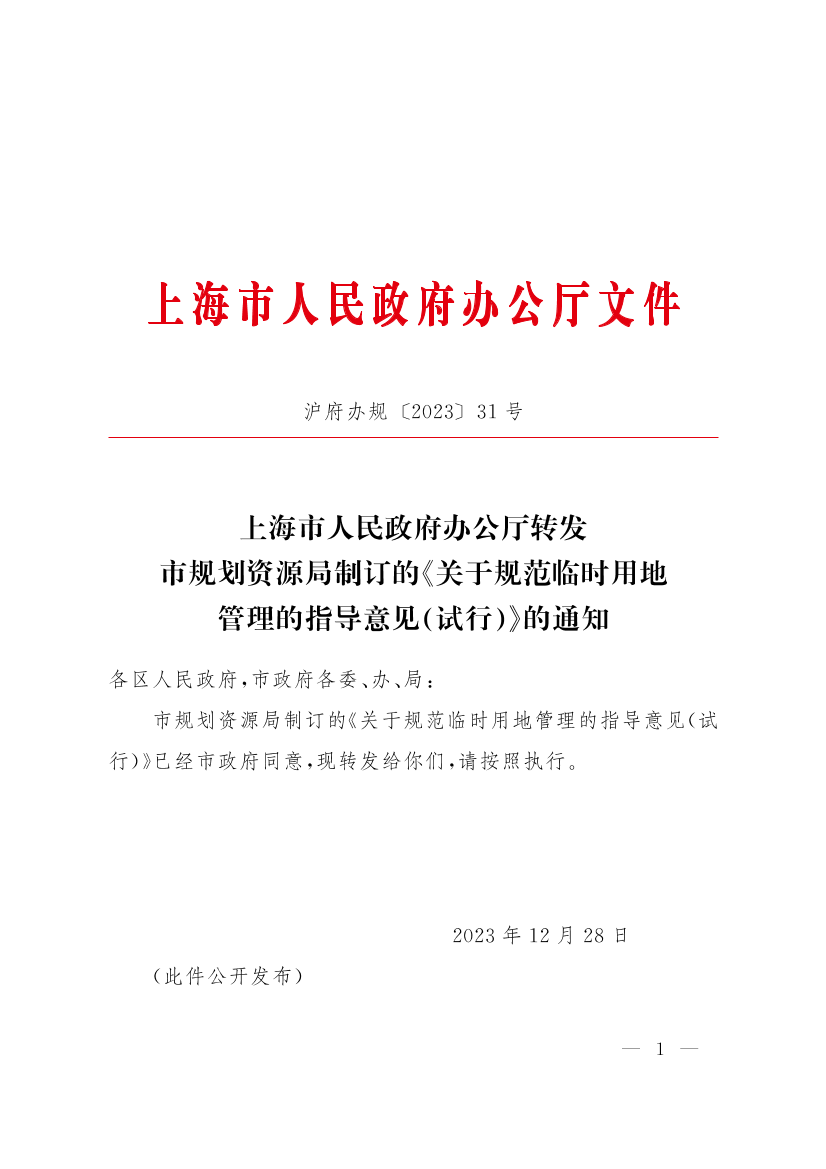 上海市人民政府办公厅转发市规划资源局制订的《关于规范临时用地管理的指导意见(试行)》的通知