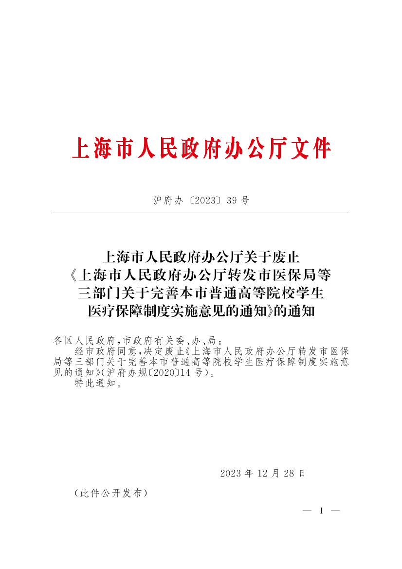 经市政府同意,决定废止《上海市人民政府办公厅转发市医保局等三部门关于完善本市普通高等院校学生医疗保障制度实施意见的通知》(沪府办规〔2020〕14号)。