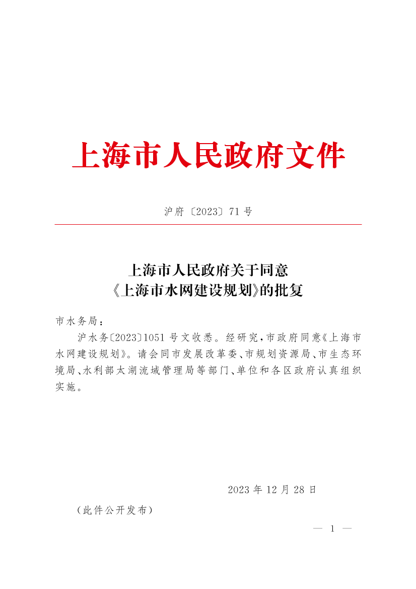 沪水务〔2023〕1051号文收悉。经研究,市政府同意《上海市水网建设规划》。请会同市发展改革委、市规划资源局、市生态环境局、水利部太湖流域管理局等部门、单位和各区政府认真组织实施。