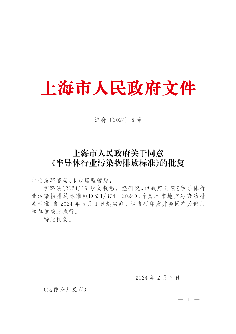 沪环法〔2024〕19号文收悉。经研究,市政府同意《半导体行业污染物排放标准》(DB31/374—2024),作为本市地方污染物排放标准,自2024年5月1日起实施。请自行印发并会同有关部门和单位按此执行。