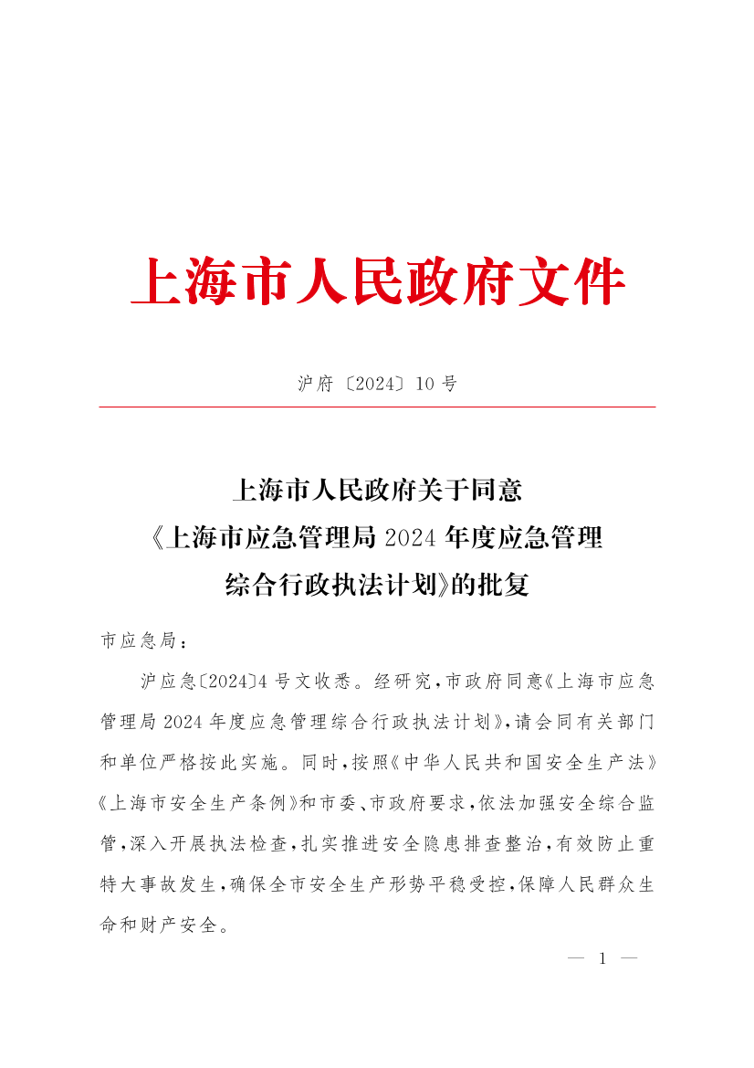 沪应急〔2024〕4号文收悉。经研究,市政府同意《上海市应急管理局2024年度应急管理综合行政执法计划》,请会同有关部门和单位严格按此实施。同时,按照《中华人民共和国安全生产法》《上海市安全生产条例》和市委、市政府要求,依法加强安全综合监管,深入开展执法检查,扎实推进安全隐患排查整治,有效防止重特大事故发生,确保全市安全生产形势平稳受控,保障人民群众生命和财产安全。