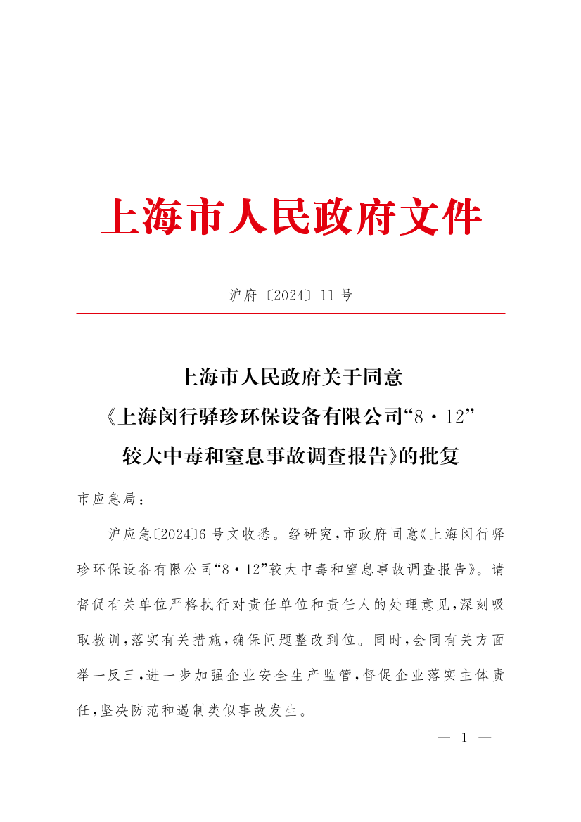 沪应急〔2024〕6号文收悉。经研究,市政府同意《上海闵行驿珍环保设备有限公司“8·12”较大中毒和窒息事故调查报告》。请督促有关单位严格执行对责任单位和责任人的处理意见,深刻吸取教训,落实有关措施,确保问题整改到位。同时,会同有关方面举一反三,进一步加强企业安全生产监管,督促企业落实主体责任,坚决防范和遏制类似事故发生。