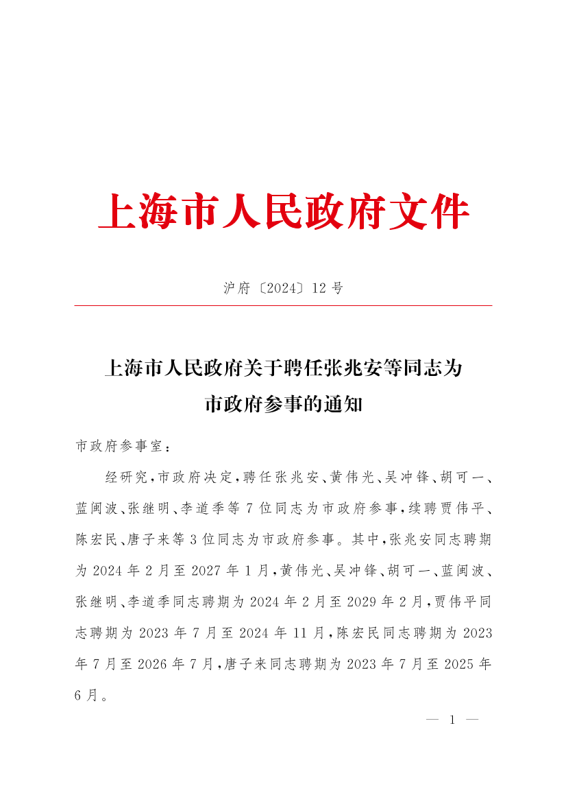 经研究,市政府决定,聘任张兆安、黄伟光、吴冲锋、胡可一、蓝闽波、张继明、李道季等7位同志为市政府参事,续聘贾伟平、陈宏民、唐子来等3位同志为市政府参事。其中,张兆安同志聘期为2024年2月至2027年1月,黄伟光、吴冲锋、胡可一、蓝闽波、张继明、李道季同志聘期为2024年2月至2029年2月,贾伟平同志聘期为2023年7月至2024年11月,陈宏民同志聘期为2023年7月至2026年7月,唐子来同志聘期为2023年7月至2025年6月。