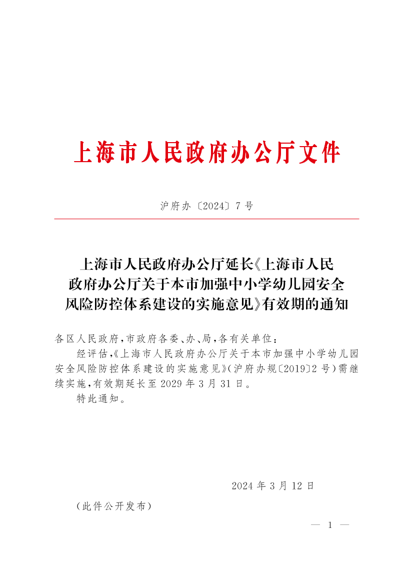 经评估,《上海市人民政府办公厅关于本市加强中小学幼儿园安全风险防控体系建设的实施意见》(沪府办规〔2019〕2号)需继续实施,有效期延长至2029年3月31日。