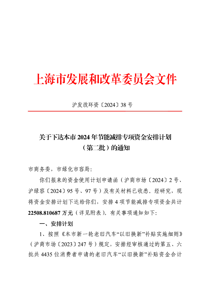 你们报来的资金使用计划申请函(沪商市场〔2024〕2号、沪绿容〔2024〕95号、97号)及有关材料已收悉。经研究,现将资金安排计划下达给你们,安排4项节能减排专项资金共计22508.810687万元(详见附表)。有关事项通知如下: