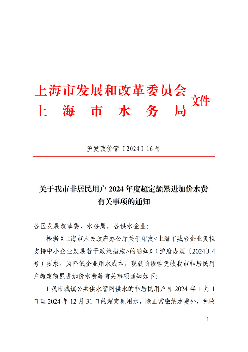 根据《上海市人民政府办公厅关于印发<上海市减轻企业负担支持中小企业发展若干政策措施>的通知》(沪府办规〔2024〕4号)要求,为降低企业用水成本,现就阶段性免收我市非居民用户超定额累进加价水费等有关事项通知如下: