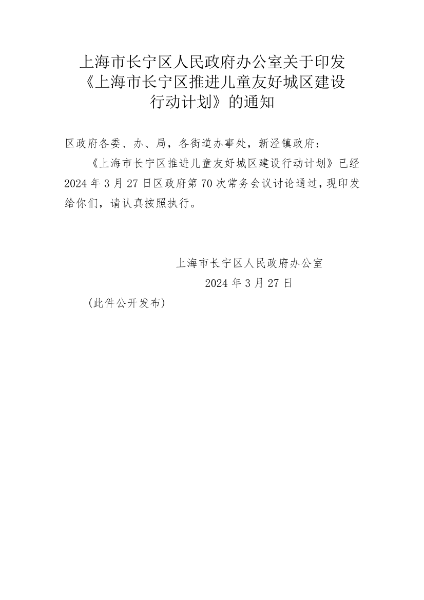 《上海市长宁区推进儿童友好城区建设行动计划》已经2024年3月27日区政府第70次常务会议讨论通过,现印发给你们,请认真按照执行。
