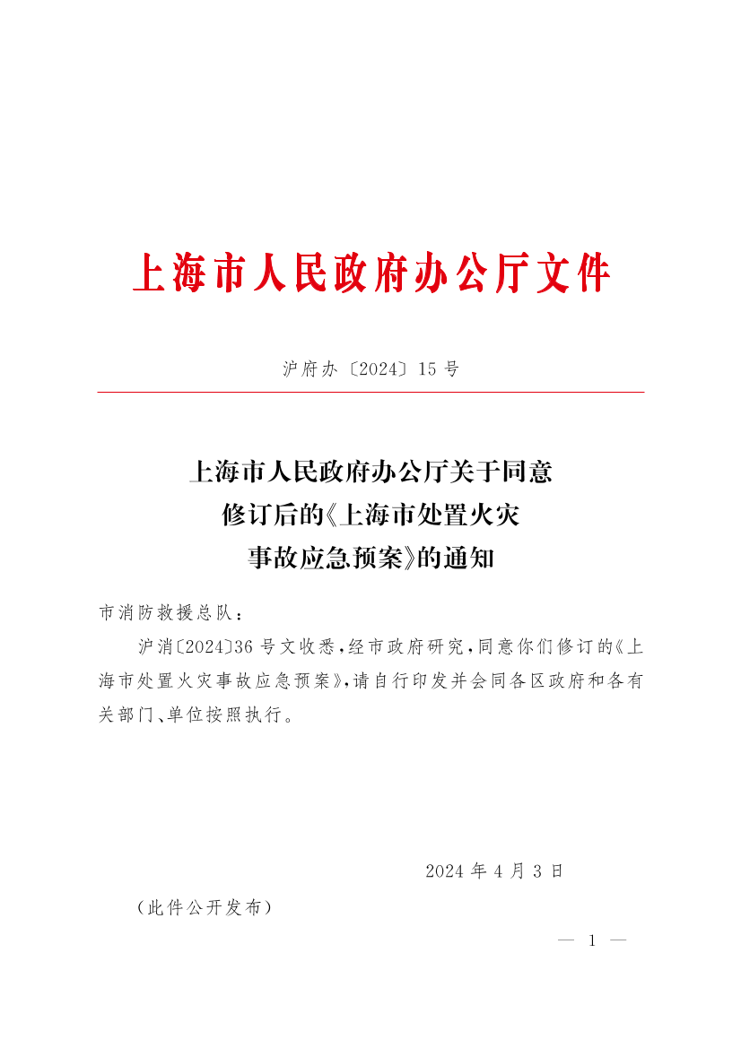 沪消〔2024〕36号文收悉,经市政府研究,同意你们修订的《上海市处置火灾事故应急预案》,请自行印发并会同各区政府和各有关部门、单位按照执行。