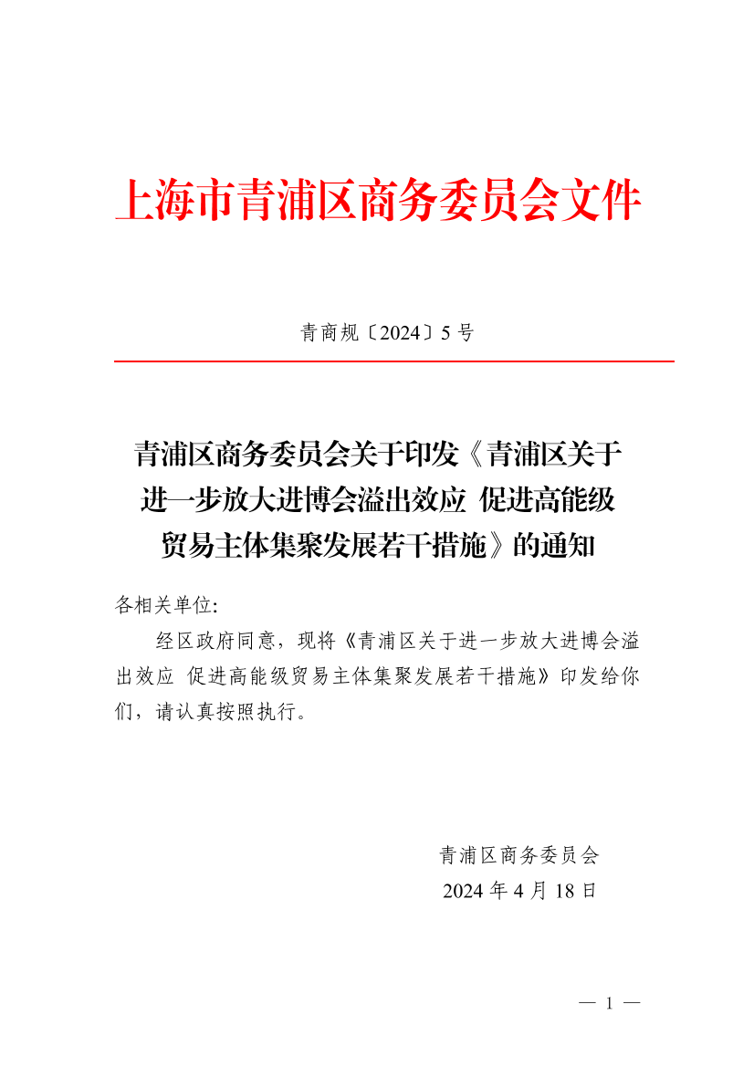 关于印发《青浦区关于进一步放大进博会溢出效应 促进高能级贸易主体集聚发展若干措施》的通知
