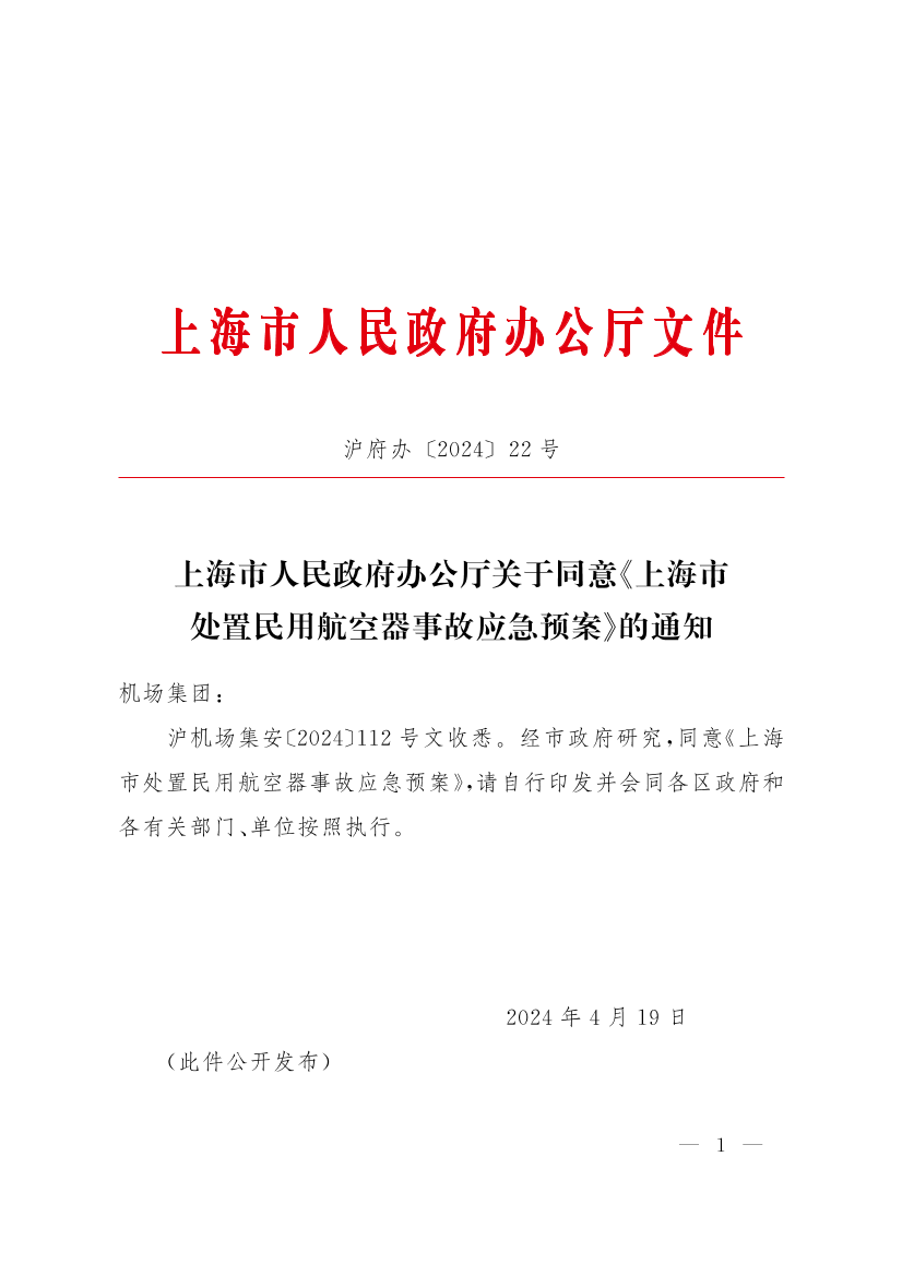 沪机场集安〔2024〕112号文收悉。经市政府研究,同意《上海市处置民用航空器事故应急预案》,请自行印发并会同各区政府和各有关部门、单位按照执行。