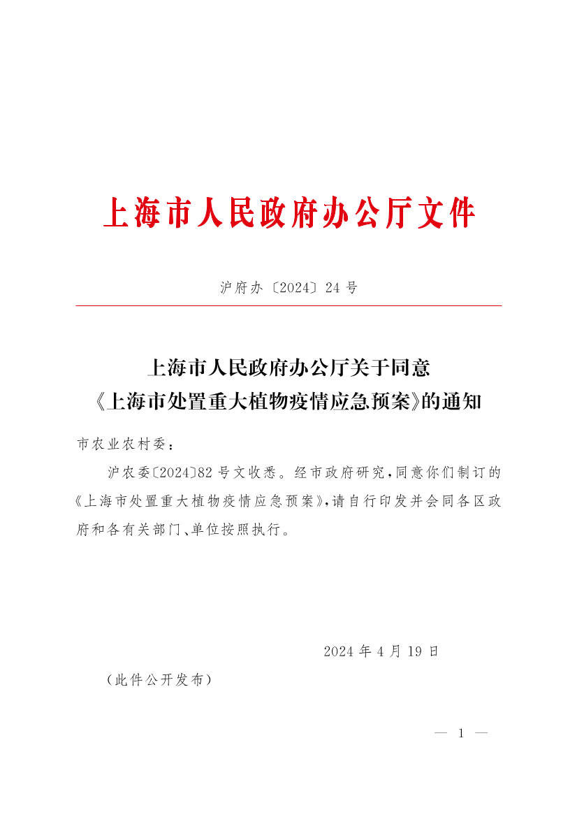 沪农委〔2024〕82号文收悉。经市政府研究,同意你们制订的《上海市处置重大植物疫情应急预案》,请自行印发并会同各区政府和各有关部门、单位按照执行。