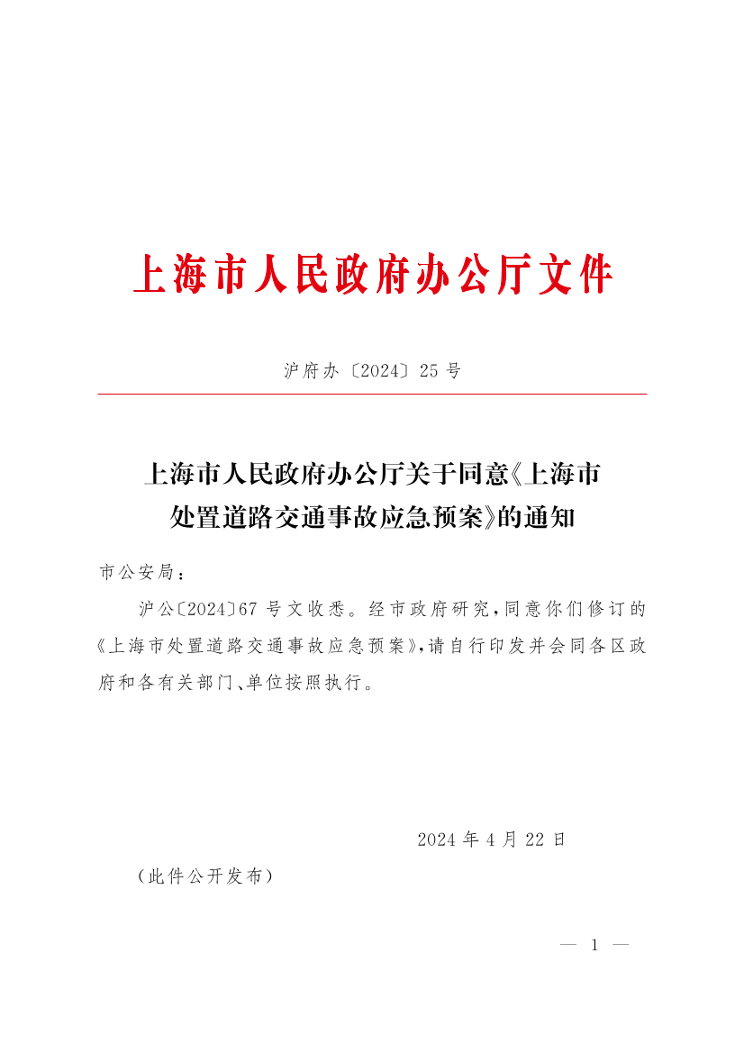 沪公〔2024〕67号文收悉。经市政府研究,同意你们修订的《上海市处置道路交通事故应急预案》,请自行印发并会同各区政府和各有关部门、单位按照执行。