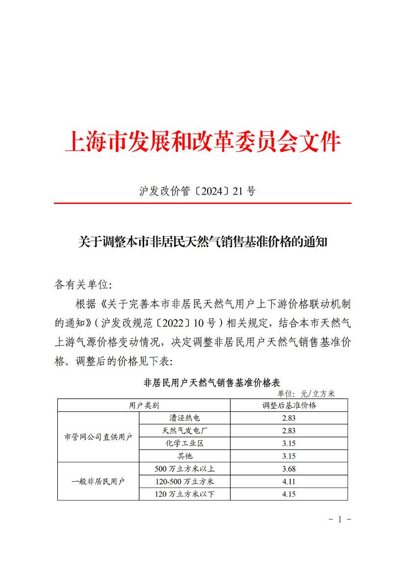 根据《关于完善本市非居民天然气用户上下游价格联动机制的通知》(沪发改规范〔2022〕10号)相关规定,结合本市天然气上游气源价格变动情况,决定调整非居民用户天然气销售基准价格。调整后的价格见下表: