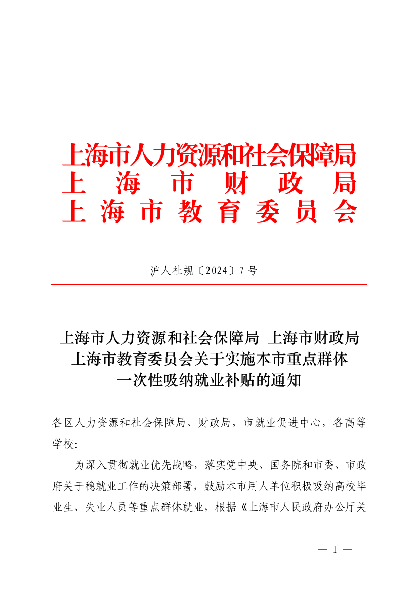 为深入贯彻就业优先战略,落实党中央、国务院和市委、市政府关于稳就业工作的决策部署,鼓励本市用人单位积极吸纳高校毕业生、失业人员等重点群体就业,根据《上海市人民政府办公厅关于印发〈上海市减轻企业负担支持中小企业发展若干政策措施〉的通知》(沪府办规〔2024〕4号)相关要求,现就本市用人单位吸纳重点群体就业一次性吸纳就业补贴有关事项通知如下: