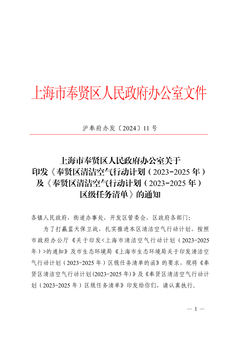 关于印发《奉贤区清洁空气行动计划(2023-2025年)及《奉贤区清洁空气行动计划(2023-2025年)区级任务清单》的通知