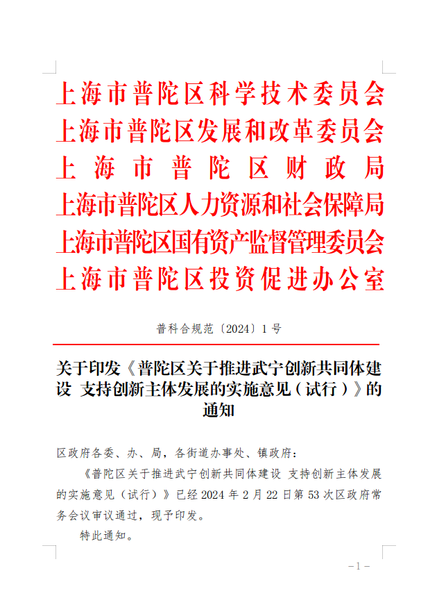 关于印发《普陀区关于推进武宁创新共同体建设 支持创新主体发展的实施意见(试行)》的通知