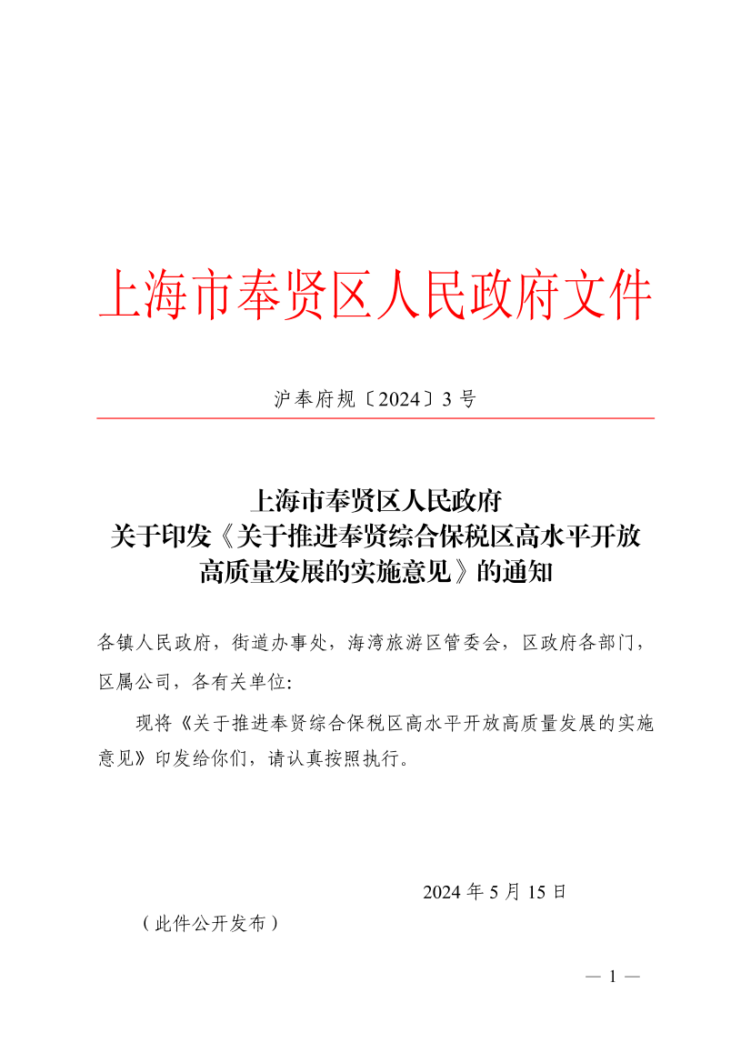 现将《关于推进奉贤综合保税区高水平开放高质量发展的实施意见》印发给你们,请认真按照执行。