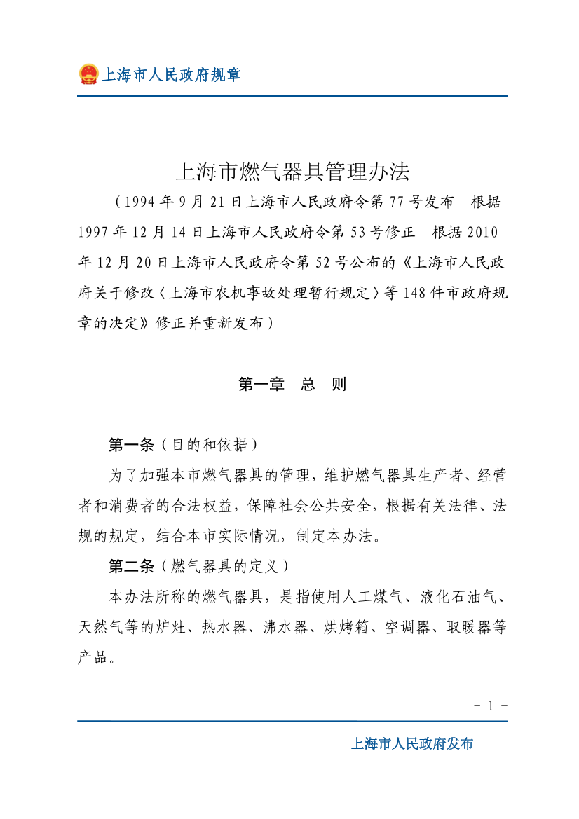 上海市城乡建设和交通委员会(以下简称市建设交通委)是本市燃气行政主管部门,负责燃气器具安装、维修质量和安全的监督管理。其所属的燃气管理处(以下称市燃气管理处)依照本办法负责日常管理。