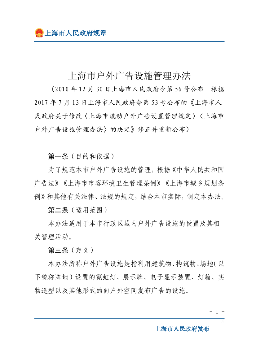 (2010年12月30日上海市人民政府令第56号公布,根据2017年7月13日上海市人民政府令第53号公布的《上海市人民政府关于修改〈上海市流动户外广告设置管理规定〉〈上海市户外广告设施管理办法〉的决定》修正并重新公布)