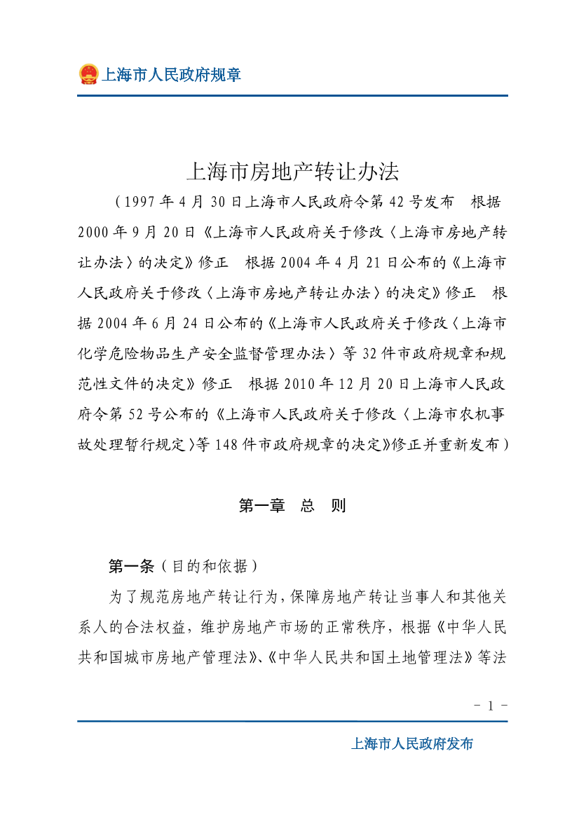 (1997年4月30日上海市人民政府令第42号发布,根据2000年9月20日《上海市人民政府关于修改〈上海市房地产转让办法〉的决定》修正,根据2004年4月21日公布的《上海市人民政府关于修改〈上海市房地产转让办法〉的决定》修正,根据2004年6月24日公布的《上海市人民政府关于修改〈上海市化学危险物品生产安全监督管理办法〉等32件市政府规章和规范性文件的决定》修正,根据2010年12月20日上海市人民政府令第52号公布的《上海市人民政府关于修改〈上海市农机事故处理暂行规定〉等148件市政府规章的决定》修正并重新发布)