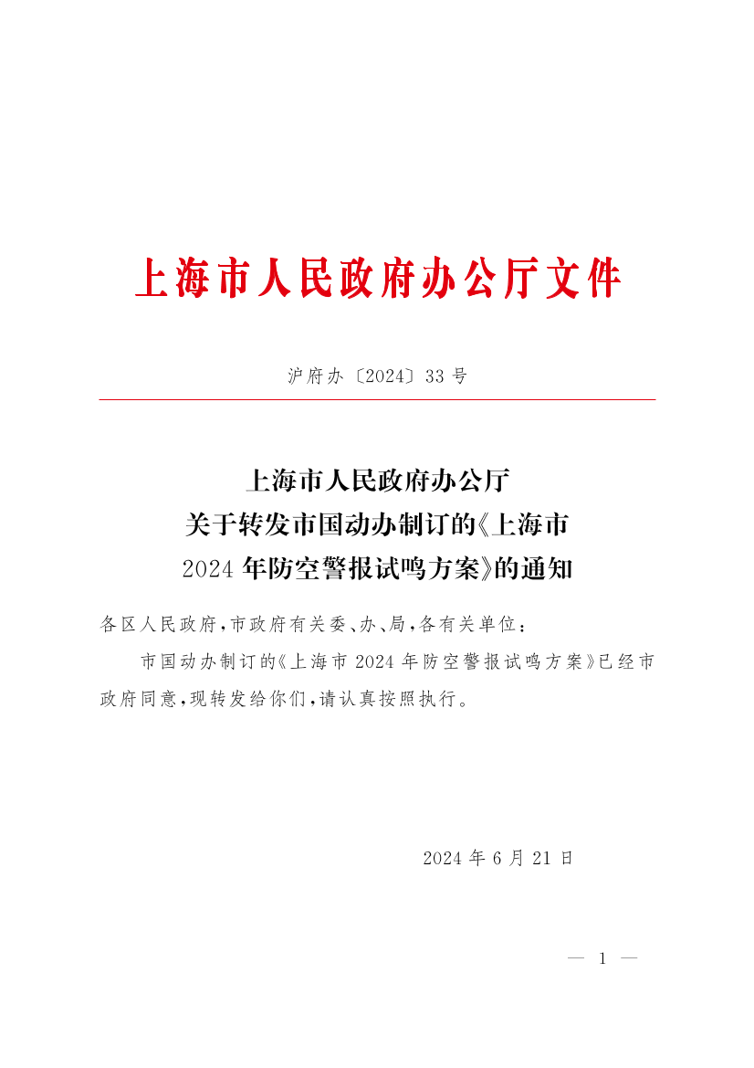 上海市人民政府办公厅关于转发市国动办制订的《上海市2024年防空警报试鸣方案》的通知