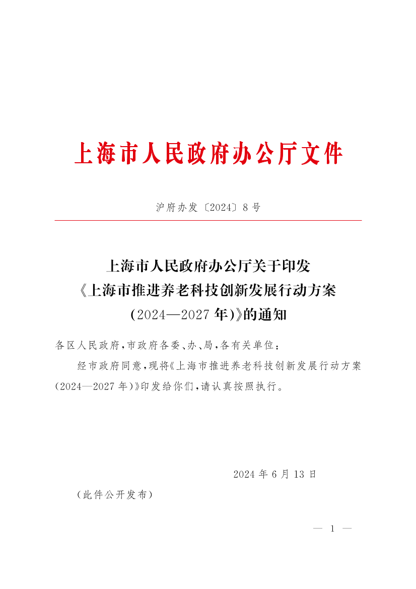 经市政府同意,现将《上海市推进养老科技创新发展行动方案(2024—2027年)》印发给你们,请认真按照执行。
