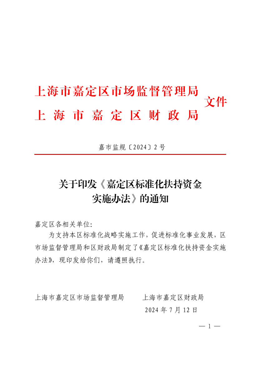 关于印发《嘉定区标准化扶持资金实施办法》的通知