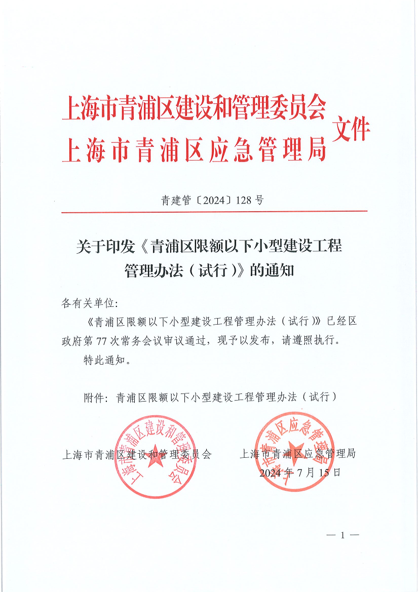 关于印发《青浦区限额以下小型建设工程管理办法(试行)》的通知