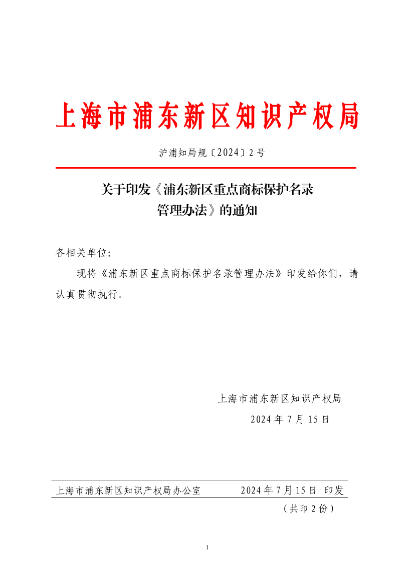 关于印发《浦东新区重点商标保护名录管理办法》的通知