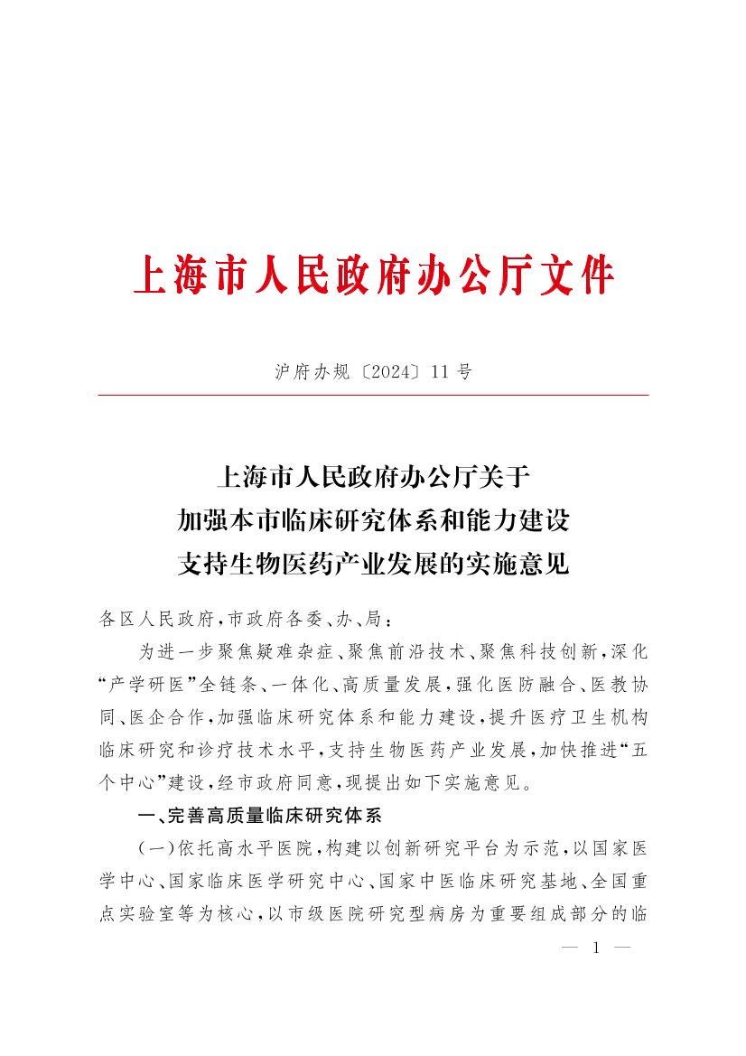上海市人民政府办公厅关于加强本市临床研究体系和能力建设支持生物医药产业发展的实施意见