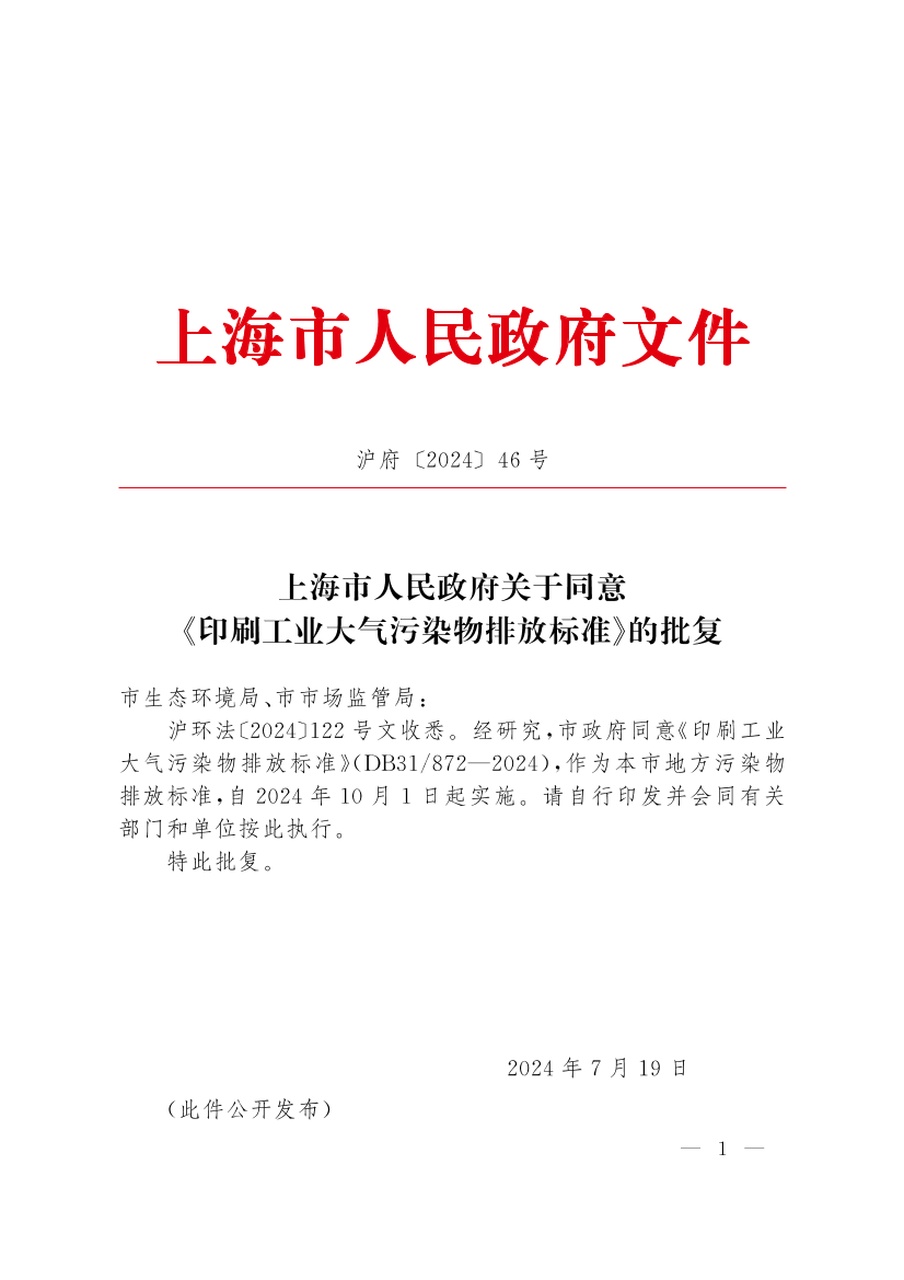 沪环法〔2024〕122号文收悉。经研究,市政府同意《印刷工业大气污染物排放标准》(DB31/872—2024),作为本市地方污染物排放标准,自2024年10月1日起实施。请自行印发并会同有关部门和单位按此执行。