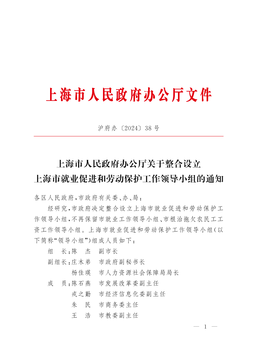 经研究,市政府决定整合设立上海市就业促进和劳动保护工作领导小组,不再保留市就业工作领导小组、市根治拖欠农民工工资工作领导小组。上海市就业促进和劳动保护工作领导小组(以下简称“领导小组”)组成人员如下:
