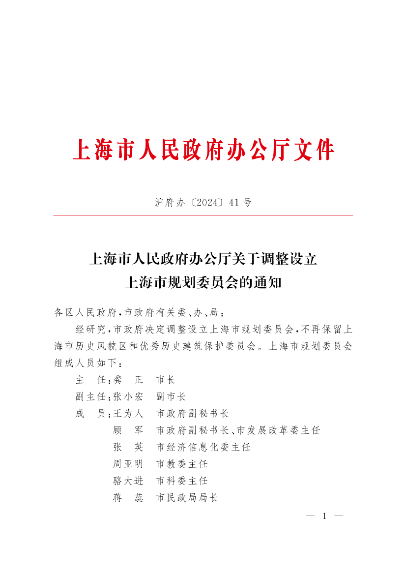 经研究,市政府决定调整设立上海市规划委员会,不再保留上海市历史风貌区和优秀历史建筑保护委员会。上海市规划委员会组成人员如下: