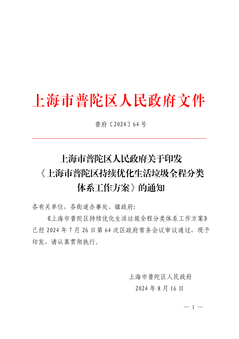 关于印发《上海市普陀区持续优化生活垃圾全程分类体系工作方案》的通知