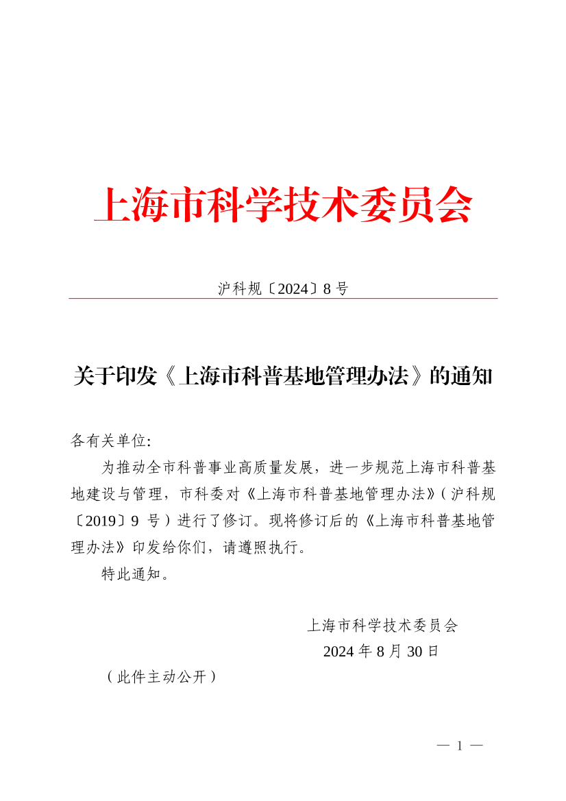 为推动全市科普事业高质量发展,进一步规范上海市科普基地建设与管理,市科委对《上海市科普基地管理办法》(沪科规〔2019〕9号)进行了修订。现将修订后的《上海市科普基地管理办法》印发给你们,请遵照执行。