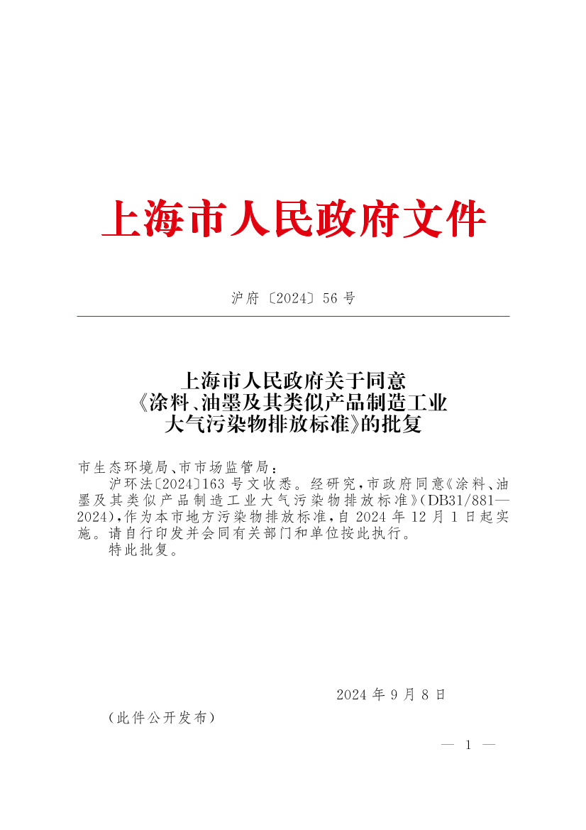 沪环法〔2024〕163号文收悉。经研究,市政府同意《涂料、油墨及其类似产品制造工业大气污染物排放标准》(DB31/881—2024),作为本市地方污染物排放标准,自2024年12月1日起实施。请自行印发并会同有关部门和单位按此执行。