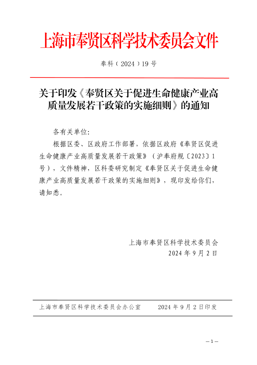关于印发《奉贤区关于促进生命健康产业高质量发展若干政策的实施细则》的通知