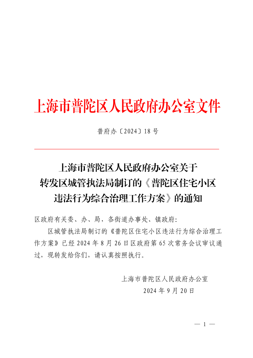 区城管执法局制订的《普陀区住宅小区违法行为综合治理工作方案》已经2024年8月26日区政府第65次常务会议审议通过,现转发给你们,请认真按照执行。
