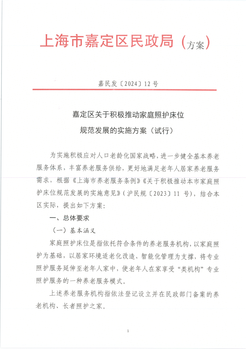 嘉定区关于积极推动家庭照护床位规范发展的实施方案(试行)