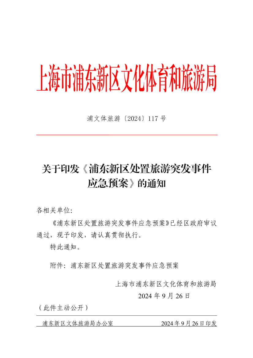 关于印发《浦东新区处置旅游突发事件应急预案》的通知