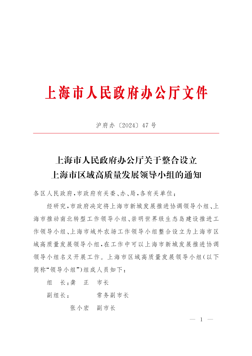 经研究,市政府决定将上海市新城发展推进协调领导小组、上海市推动南北转型工作领导小组、崇明世界级生态岛建设推进工作领导小组、上海市域外农场工作领导小组整合设立为上海市区域高质量发展领导小组,在工作中可以上海市新城发展推进协调领导小组名义开展工作。上海市区域高质量发展领导小组(以下简称“领导小组”)组成人员如下: