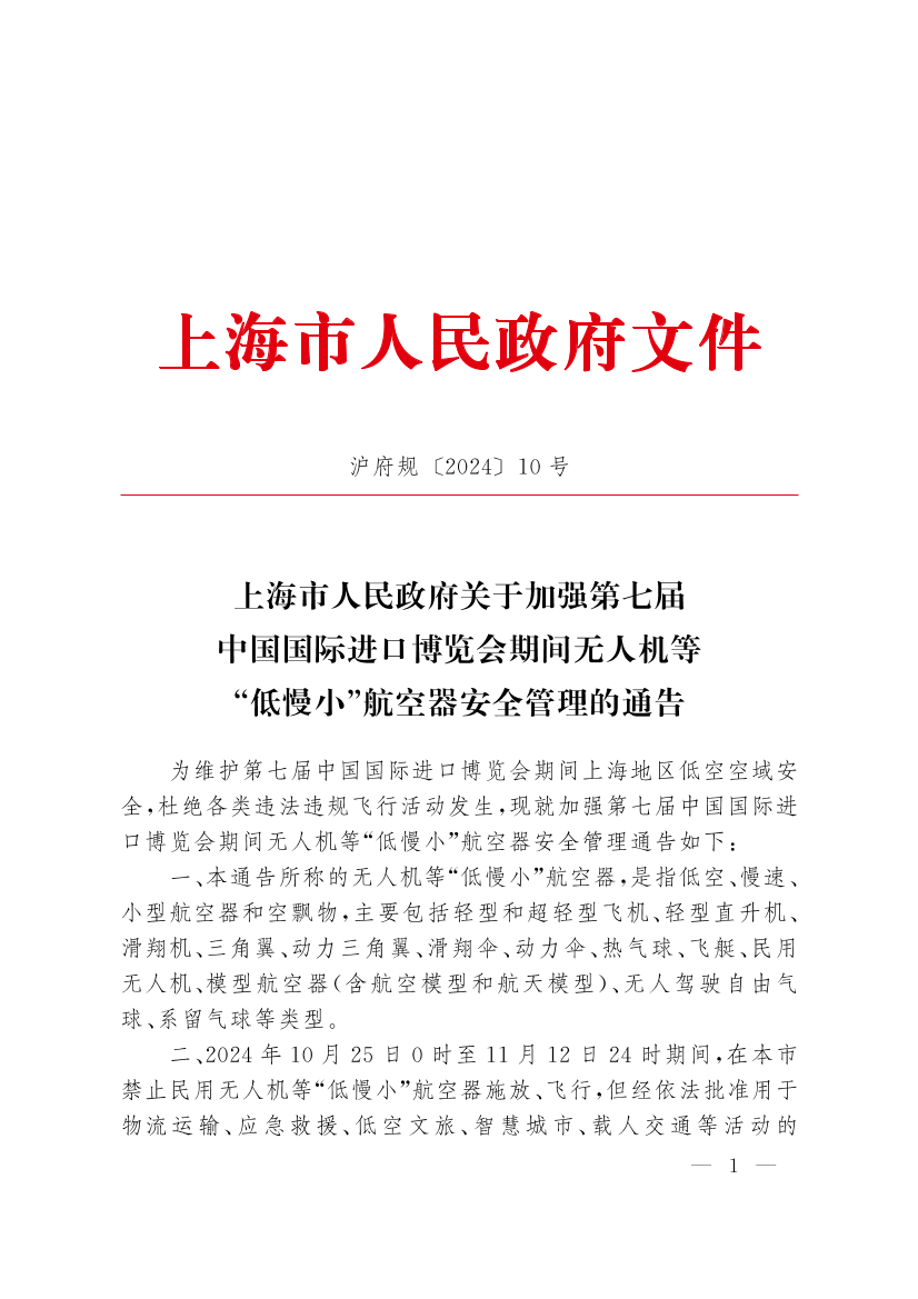 为维护第七届中国国际进口博览会期间上海地区低空空域安全,杜绝各类违法违规飞行活动发生,现就加强第七届中国国际进口博览会期间无人机等“低慢小”航空器安全管理通告如下: