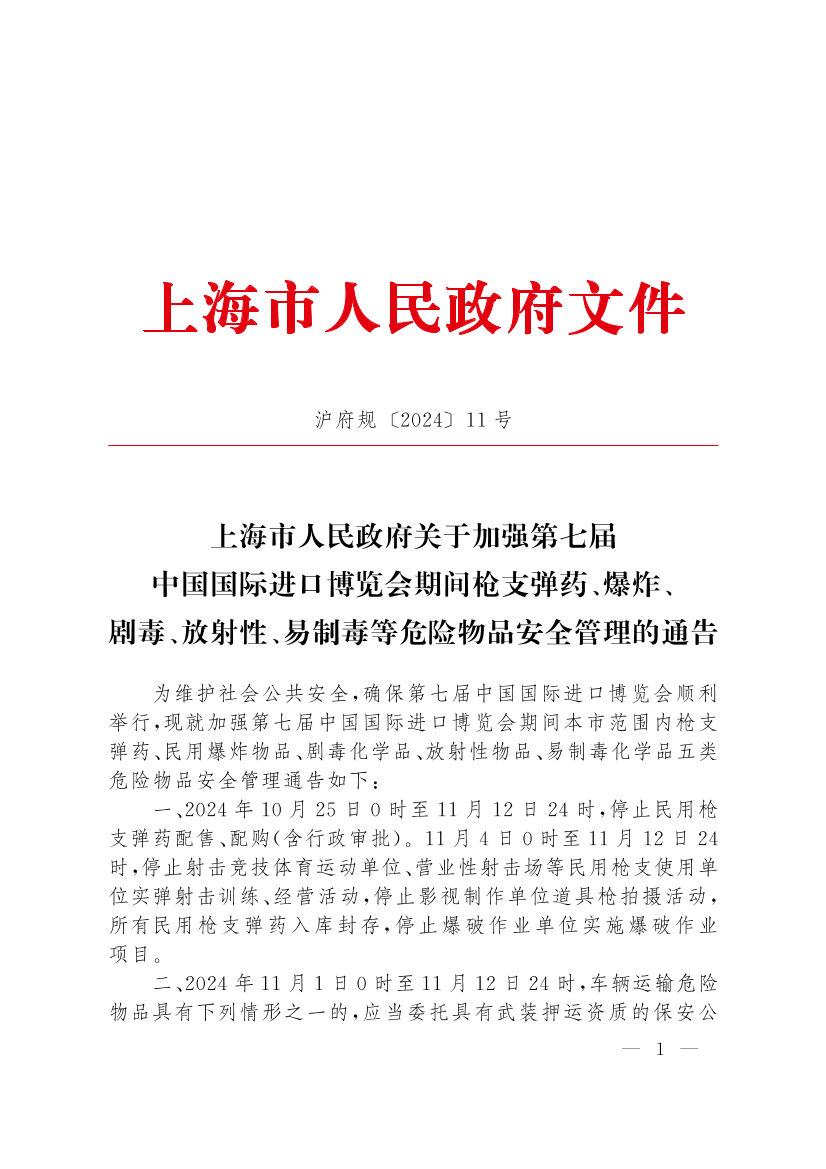 为维护社会公共安全,确保第七届中国国际进口博览会顺利举行,现就加强第七届中国国际进口博览会期间本市范围内枪支弹药、民用爆炸物品、剧毒化学品、放射性物品、易制毒化学品五类危险物品安全管理通告如下: