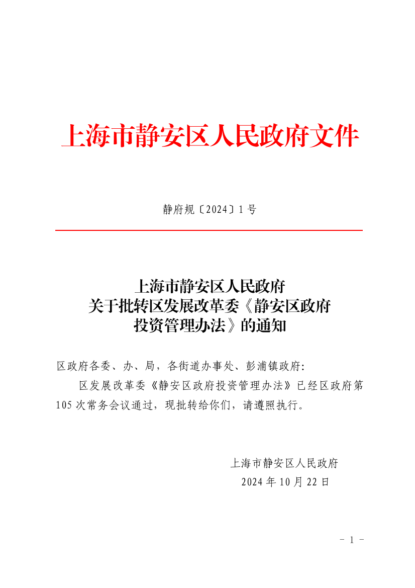 区发展改革委《静安区政府投资管理办法》已经区政府第105次常务会议通过,现批转给你们,请遵照执行。