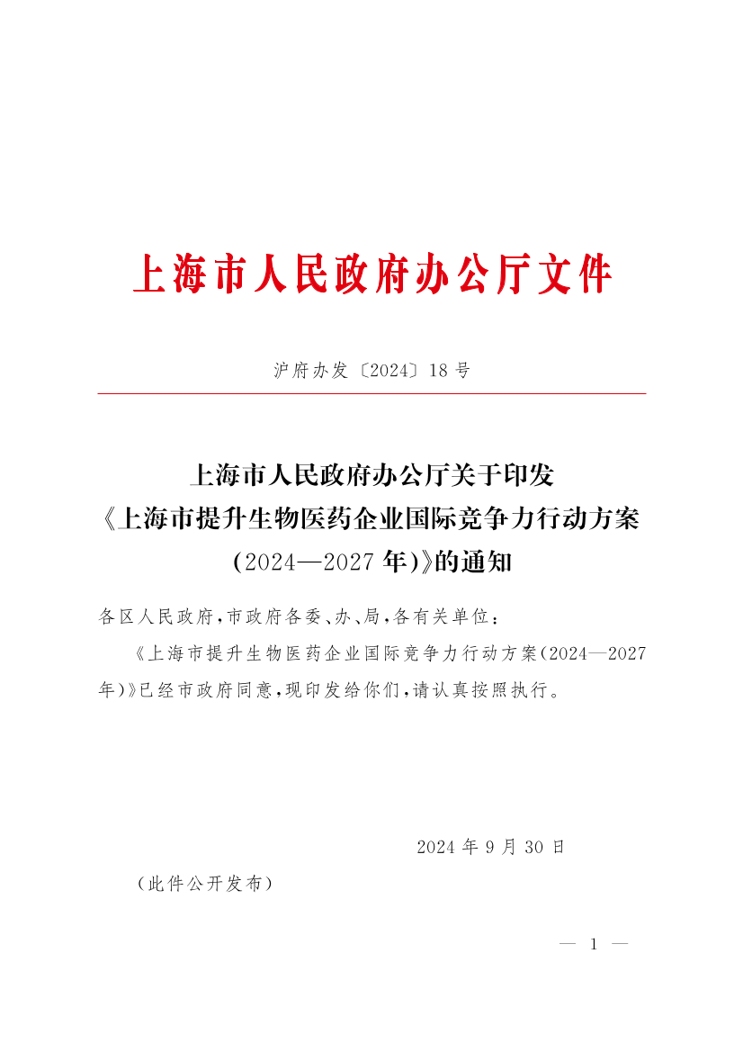 上海市人民政府办公厅关于印发《上海市提升生物医药企业国际竞争力行动方案(2024—2027年)》的通知