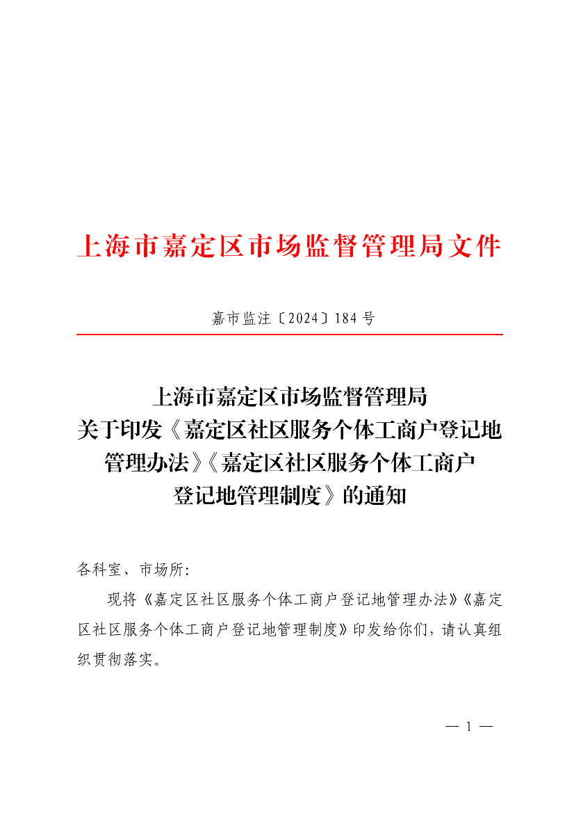 关于印发《嘉定区社区服务个体工商户登记地管理办法》《嘉定区社区服务个体工商户登记地管理制度》的通知