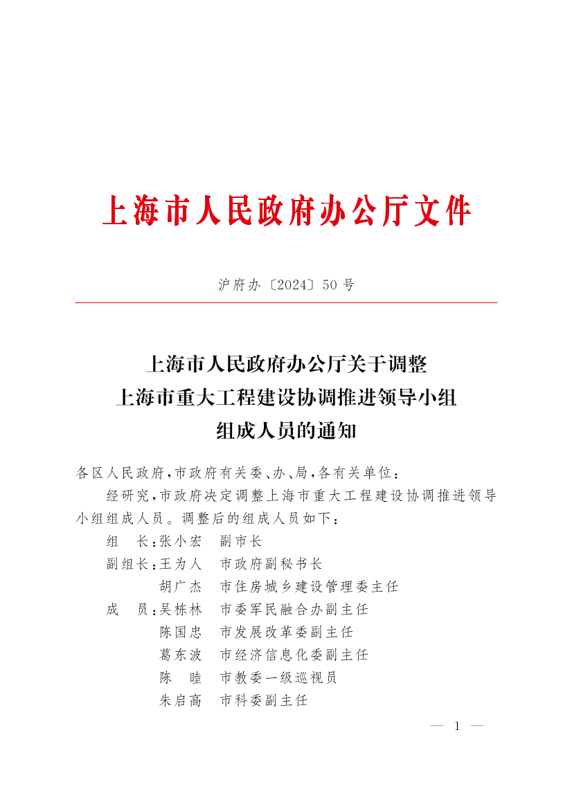 经研究,市政府决定调整上海市重大工程建设协调推进领导小组组成人员。调整后的组成人员如下: