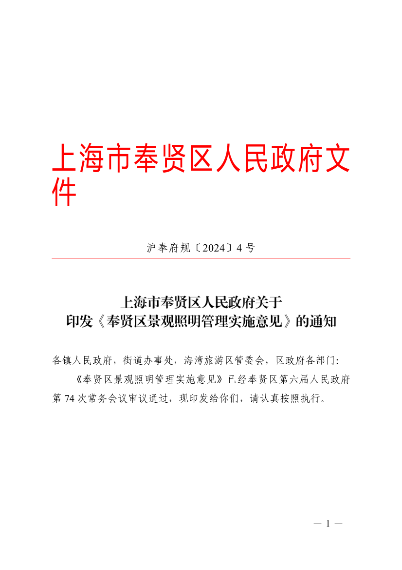 《奉贤区景观照明管理实施意见》已经奉贤区第六届人民政府第74次常务会议审议通过,现印发给你们,请认真按照执行。